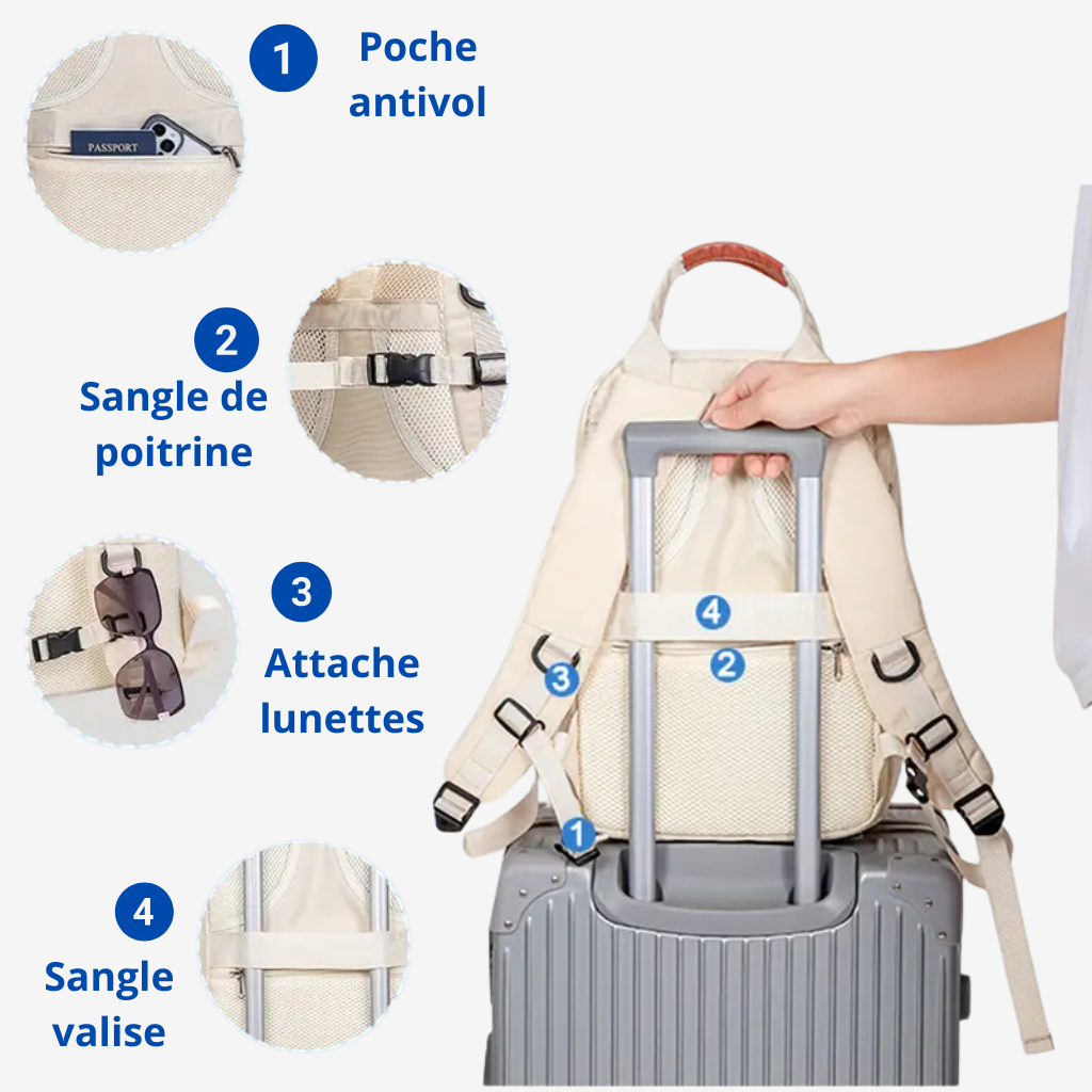 Sangle valise, poche antivol et attache lunettes pour un voyage pratique et sécurisé.