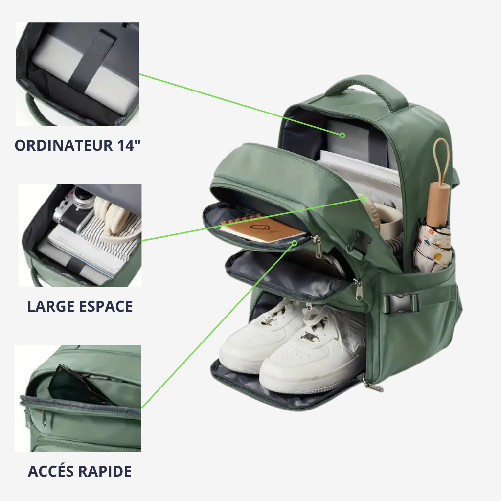 Organisation : poches frontales accessibles, compartiment principal bien structuré et rangements internes pensés pour garder vos essentiels organisés pendant tout le voyage.