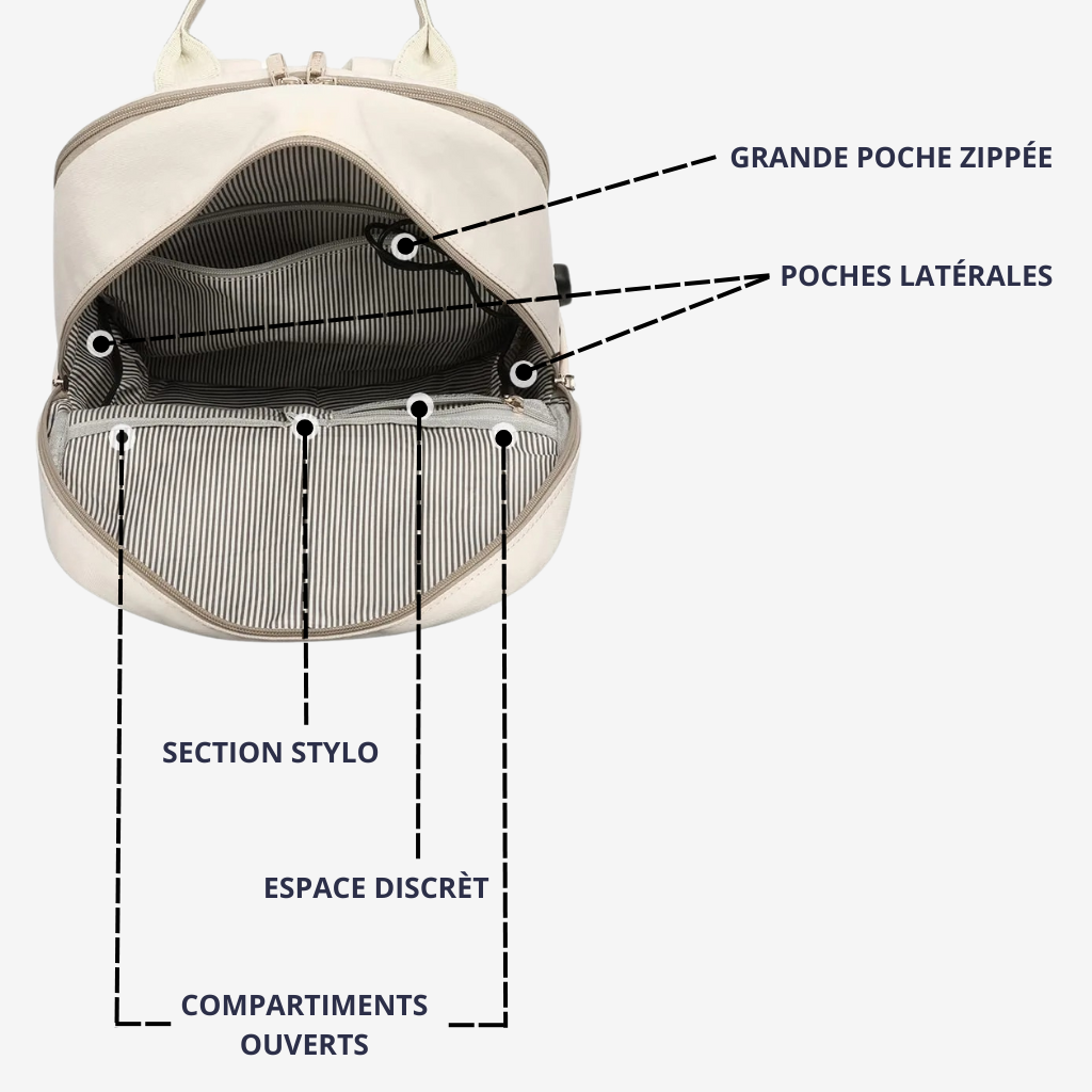 L’essentiel toujours bien organisé, dans un sac pensé pour bouger librement et sans stress.